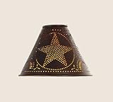 | Punched tin lamp shade in the popular country "star" pattern. Crackle black finish. Perfect size for country chandelier. This size C lamp shade is 2" at the top, 6" at the bottom and a 4" down slope on the sides. The punched star motif shines through when the light is on. This lamp shade is the finishing touch for your primitive or country lamp or chandeliers.< ...Read