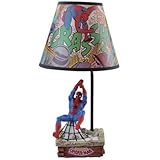 | From the Spider-Man Collection. Spider-Man Lamp with Shade. This colorful lamp features Spider-Man on the base in full costume with his arms in the air, holding on tight. The lamp shade features action packed Spider-Man comic strips. Made of resin. Takes up to a 60 watt light bulb (not included). Measures 16" high.< ...Read